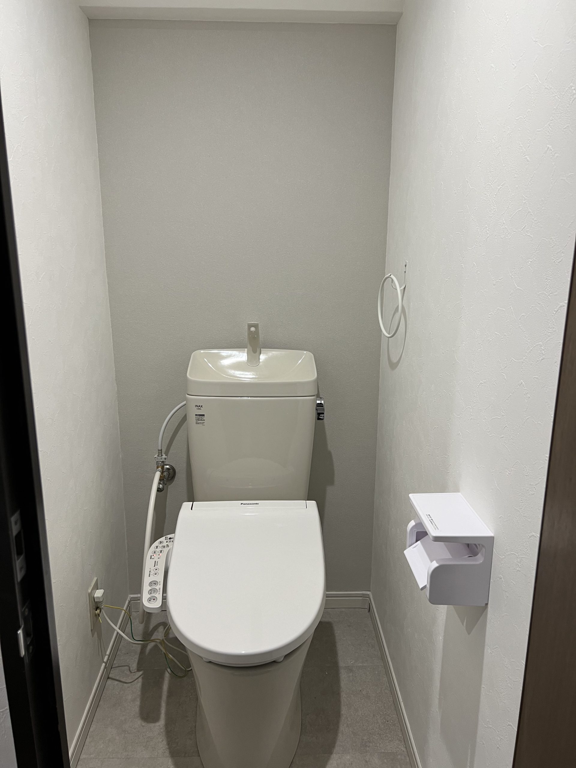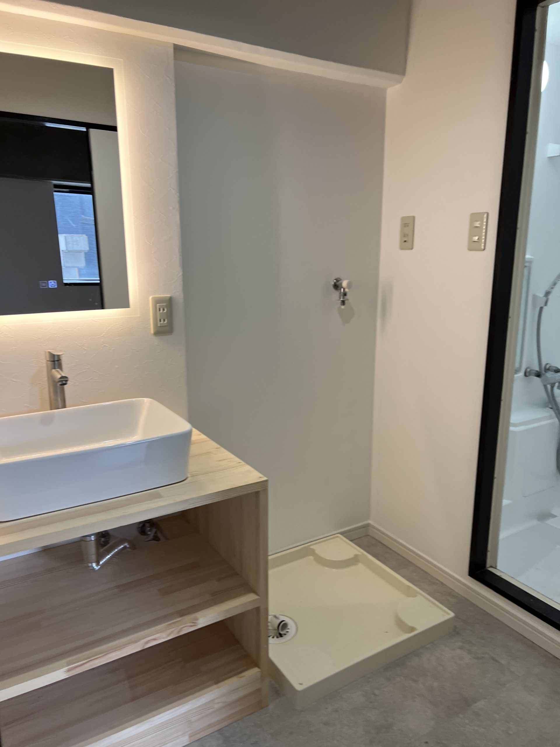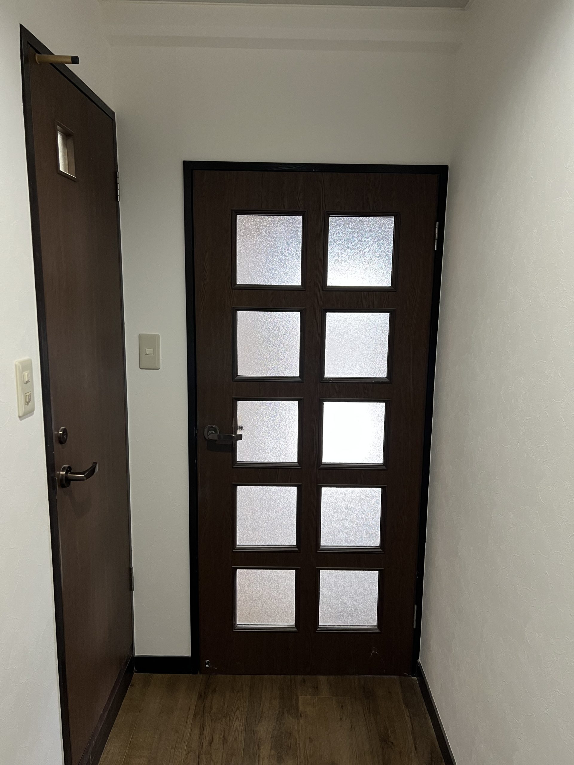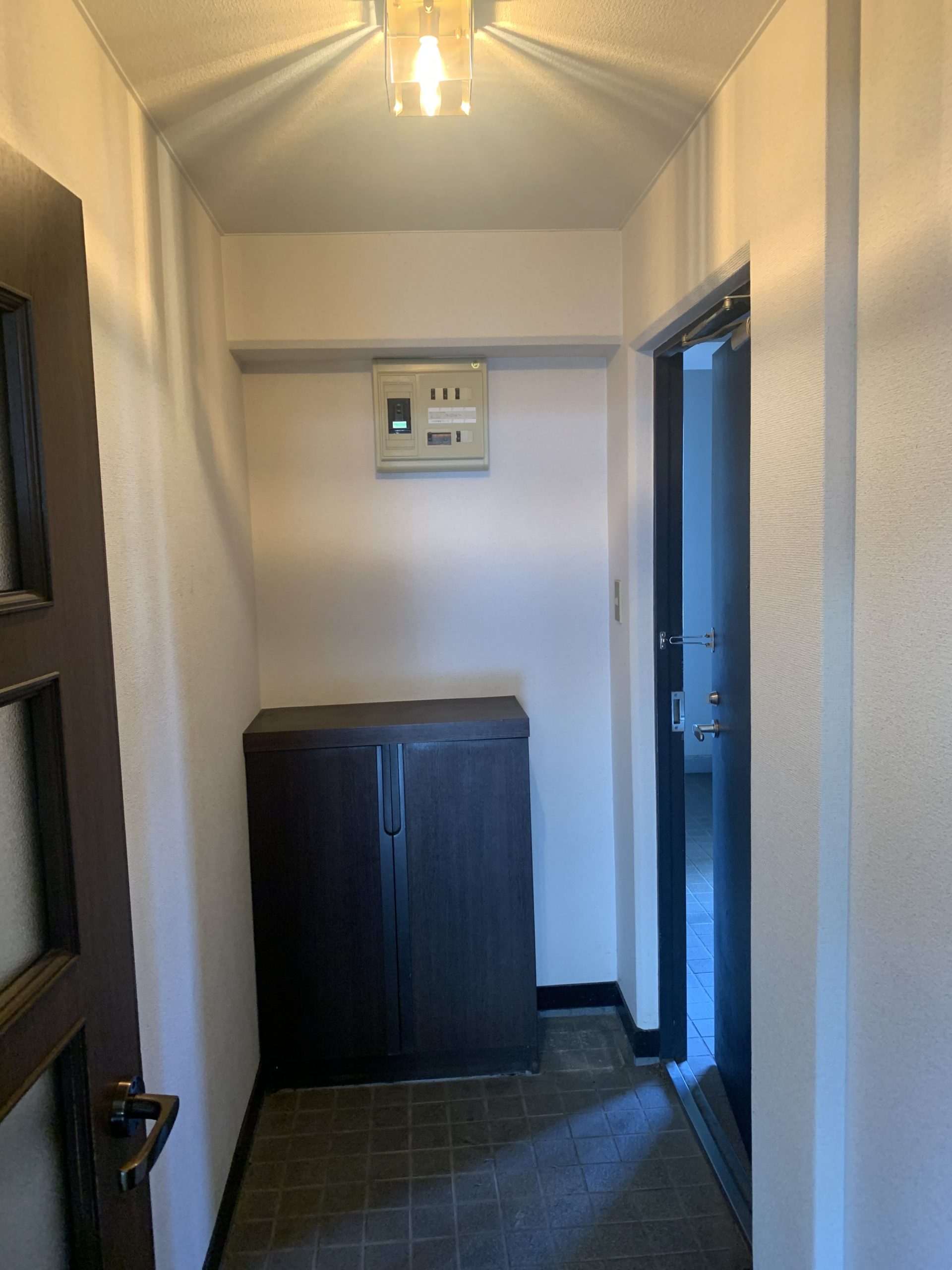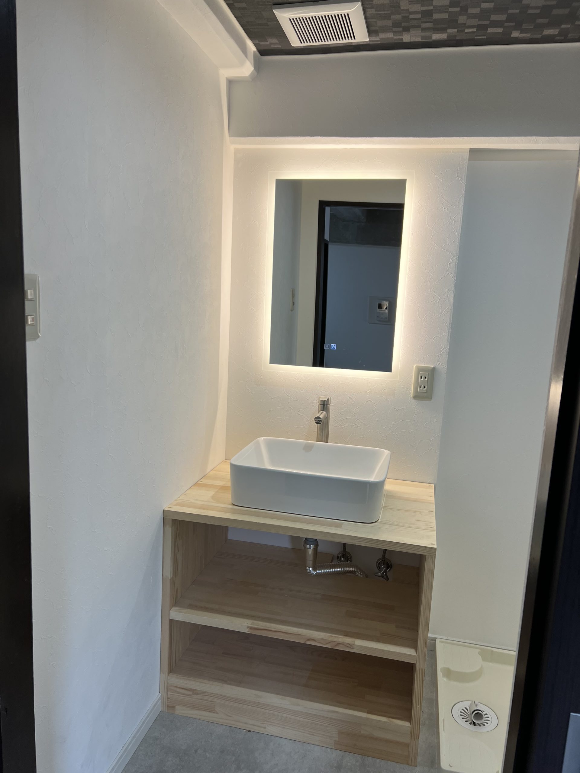 玄関にはモルタル仕上げの壁に木材の造作収納を施し、統一感をもたせました。
