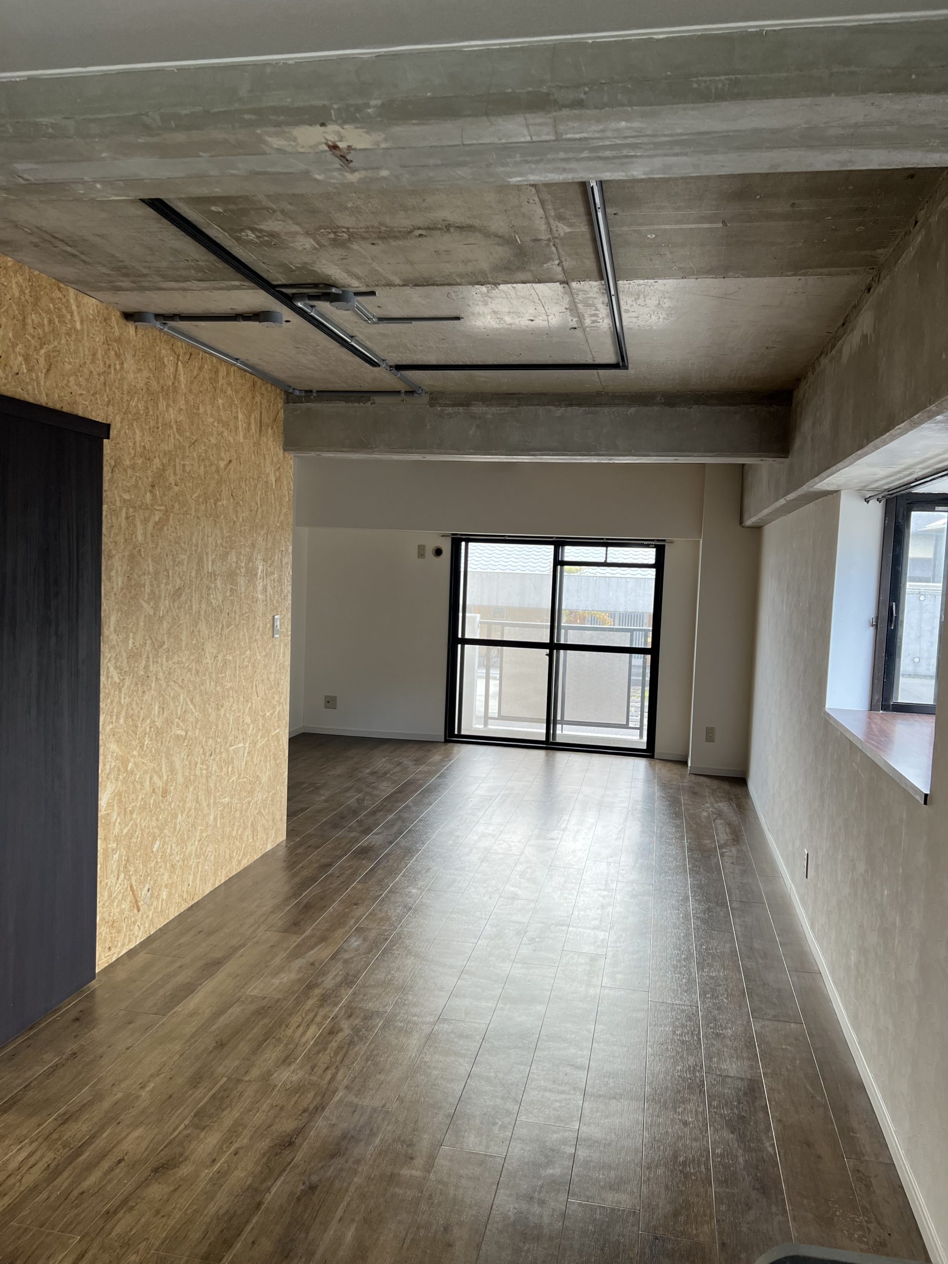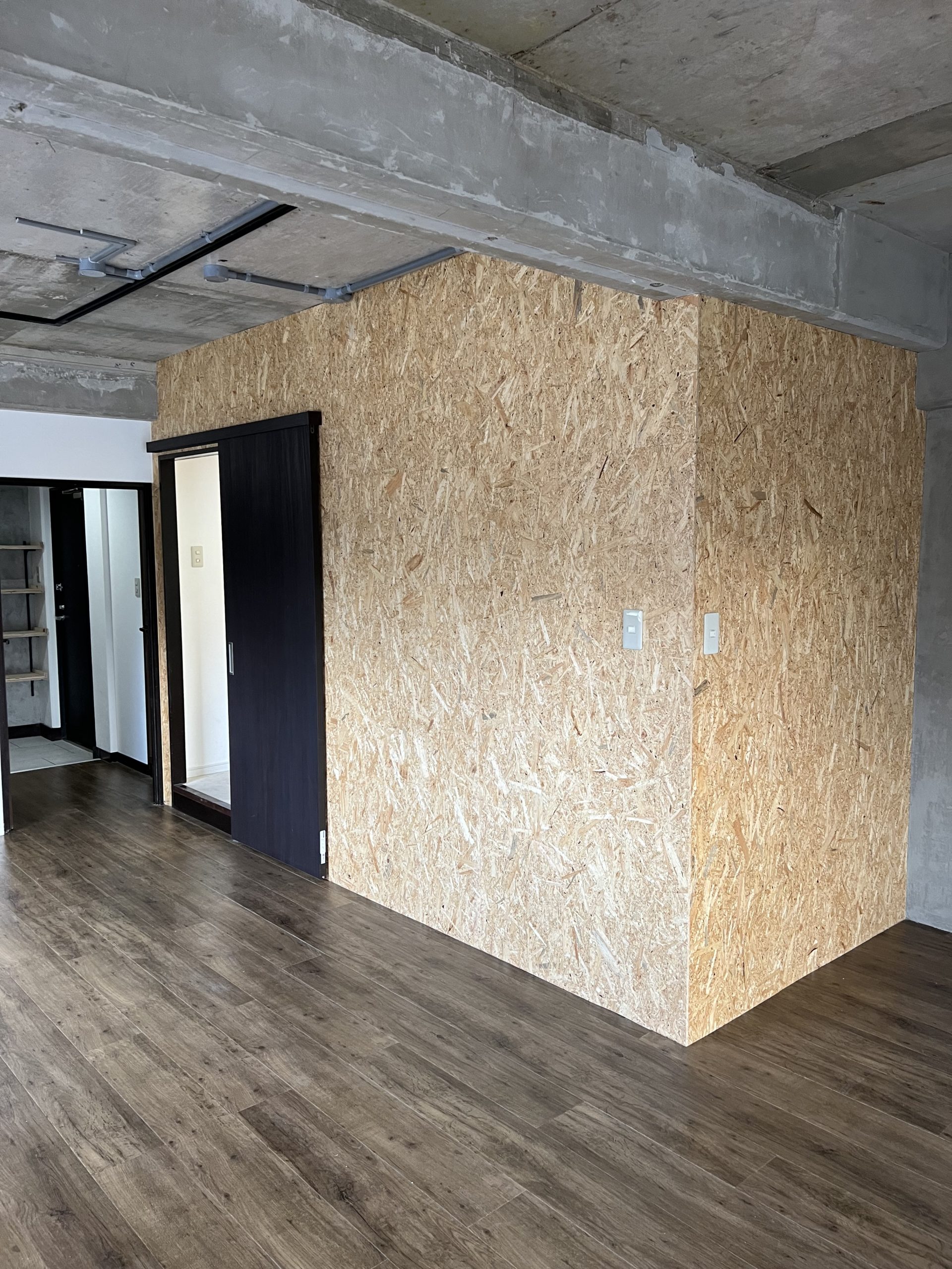 壁はコンクリート打放し×OSB合板で仕上げ、